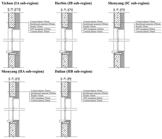 In addition, the selected flats for further comparisons are all located in the middle levels of the dwellings to eliminate the influence of solar radiation on the roof portion and the effects of ground heat transfer at the bottom levels. The Thinsulation of external wall was the variable in the simulations, while the other construction layers, including roofs and ground floors were held constant in each city. The U-values of the windows were also not altered in the simulations. The values above are in accordance with local standards and actual circumstances. The detailed envelope configuration and U-values of these components are as shown in Figure 5 and Table 5.