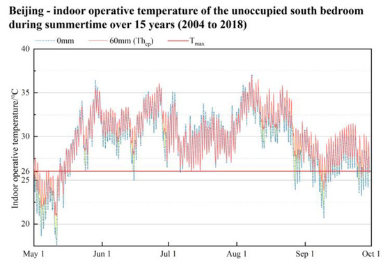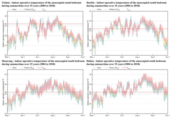 According to the simulation results applied with TMY files over the 15 years (2004–2018), the buildings were overheated to varying degrees in the five cities. All the rooms were overheated significantly, with HE% significantly exceeding the threshold of 1%. Table 9 shows the overheating duration in the flats during summer (from May to September) when the thickness of the insulation was altered. For both living rooms and bedrooms, all the insulated flats were more overheated than the uninsulated ones (where Thinsulation = 0). The rooms of each flat tended to be more overheated when the insulation was thicker. Compared to flats constructed with the current standard value of insulation thickness, there were reductions in overheating hours of 245 h in Yichun (22.5%), 335 h in Harbin (13.0%), 399 h in Shenyang (20.3%), 269 h in Dalian (11.8%) and 214 h in Beijing (6.9%). For living rooms, overheating hours in the uninsulated flats decreased by 12 in Yichun (35.3%), 275 in Harbin (16.6%), 517 in Shenyang (60.0%), 289 in Dalian (22.3%), and 208 in Beijing (8.3%). The indoor operative temperatures of the flats constructed with Thcp and without insulation differed significantly according to the period (Figure 6). For a large portion of the period, the indoor temperatures in the flats constructed with the current standard value of insulation thickness were higher than those in the uninsulated ones, although they were lower in specific periods.