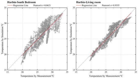To enhance the reliability of the simulations, the simulated indoor temperatures from May to September of 2021 were validated against the measured data from the unoccupied flat in Harbin. Time series comparisons between the hourly monitored data and simulated indoor temperatures during summertime of 2021 were conducted. According to the regression results from the 3672 pairs of datasets, there was a moderate correlation between the measured data and the simulated results (Figure 7). In Figure 7, the grey line represents equation y = x, an ideal state, which indicates that the simulated and measured data are equal; the regression lines in the south-facing bedroom and living room show a moderate consistency. According to the calculated results from Equation (1), the values of Pearson’s r were uii0.8621 and 0.9355 in the living room and bedroom (facing south), respectively. The regression equations are given as Equations (5) and (6). According to the regression results, the simulated data were in great consistency with the real data. The simulations can therefore provide reliable prediction on the overheating performance when the thickness of thermal insulation is altered as an independent variable.