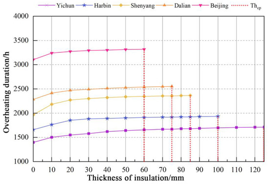 The unoccupied flats in the simulation tended to be more overheated when constructed with thicker insulation (Figure 8). The current standard values of Thinsulation in the local standards can lead to more overheated indoor environments in the severe cold and cold regions. As the insulation increased, the overheating duration increased significantly in all the cities. However, its rate of increase tended to gradually decline. This can be explained by the relationship between the U-value of the envelope and Thinsulation, as shown in Figure 4: the decrease rate of the U-value declines as Thinsulation increases, before the U-value reaches a convergence. Additionally, an upward trend in overheating hours was observed as the latitude decreases from Yichun (IA sub-region) to Beijing (IIB sub-region).