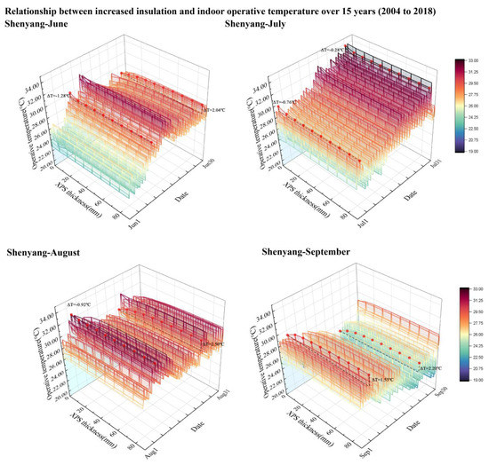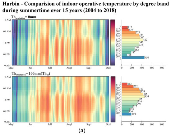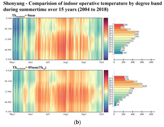 The simulation applied with the local meteorological weather file of 2021 was carried out. The simulated overheating performance of the unoccupied flat in Harbin is shown in the Table 10, which was in accordance with the actual circumstance of the monitored flat of the city. The level and situation of the flat was selected on the basis of the actual circumstance to achieve corresponding simulation results, which was also used for validation against measured data. It can be found that increased insulation can exacerbate overheating performance in 2021 as well, which shows a similar trend as the simulated results applied with TMY files over the past 15 years (2004 to 2018).