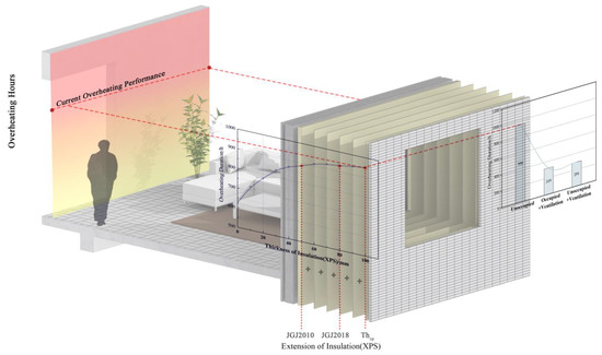 To examine the influence of increased insulation on overheating, the U-value of the wall was used as the main variable. The thermal transmittance of the wall was altered by adjusting the thickness of the insulation layer (extruded polystyrene). Thinsulation was used to represent the thickness of the thermal insulation, and Thcp was used to represent the thickness of the insulation applied in the current standards [37]. In each city, the range of thicknesses was different in the simulation settings, as shown in Figure 4. The highest value of Thinsulation (i.e., Thcp) in each city was used for consistency with the current standard value of the city, which has been widely applied in the newly built housing stock. The lowest Thinsulation (i.e., Thinsulation = 0) of each city was used to examine overheating when the model building was uninsulated. In the simulation of each city, the thickness of the insulation was increased in 10 mm steps until it reached Thcp. Each model building constructed with a different Thinsulation was created in a simulation file in IESVE for further comparisons of overheating with different levels of insulation. Table 4 shows the range of Thinsulation and the corresponding U-value of the walls in each city.