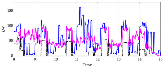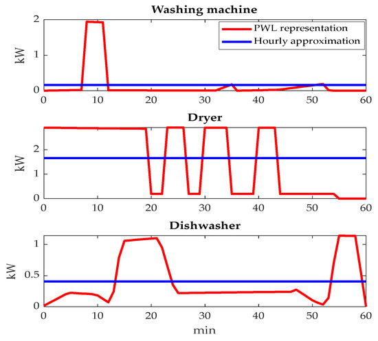 The authors of Refs. [23,25] use finite state machines for the modeling of regular and burst loads controlled through ON/OFF commands. The authors of Ref. [26] focus on centralized scheduling for large-scale flexible loads (i.e., loads possessing the ability to perform power-consumption adjustment during a certain time interval, while the total energy consumed is fixed). The loads are clustered considering their parameters (rated power, start/end time of the schedulable period, necessary work intervals) into several categories, an equivalent model is established for each category, and an aggregated model obtained by summing all the equivalent models is used for system scheduling. Models for both continuous loads (controlled through the continuous adjustment of power) and ON/OFF loads (controlled through ON/OFF commands) are provided.