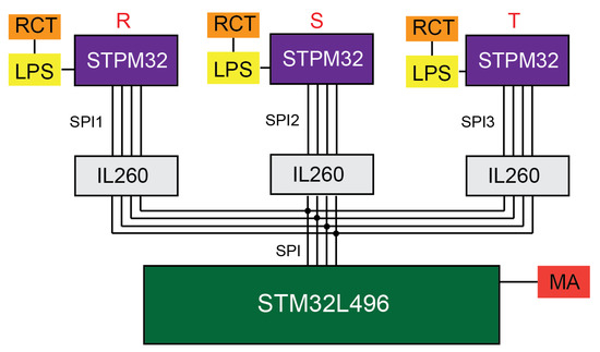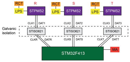 - STMicroelectronics. EVALSTPM-3PHISO: Getting Started with the STPMS2 3-ph Full Shunt Evaluation Board; UM2847; User Manual. Available online: https://www.st.com/resource/en/user_manual/um2847-evalstpm3phiso-getting-started-with-the-stpms2-3ph-full-shunt-evaluation-board-stmicroelectronics.pdf (accessed on 12 July 2022).