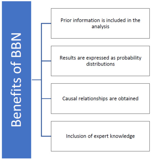Attoh-Okine [13] investigated the ability of BBN to deal with incomplete and insufficient data related to highway construction costs by developing random and associative relationships among cost variables. The probabilistic relationship and the corresponding information flow between nodes are represented by grouping the variables into environmental costs, road design costs, directed labour costs, other labour costs and material costs. Once the variables are identified, logical and dependence relationships are established among the variables. Based on the relationships obtained among the variables, the information flows among the network to generate inferences, both predictive inferences and posterior computations based on available information and historical data. The main advantages of the literature-based BBN method are shown in Figure 2.