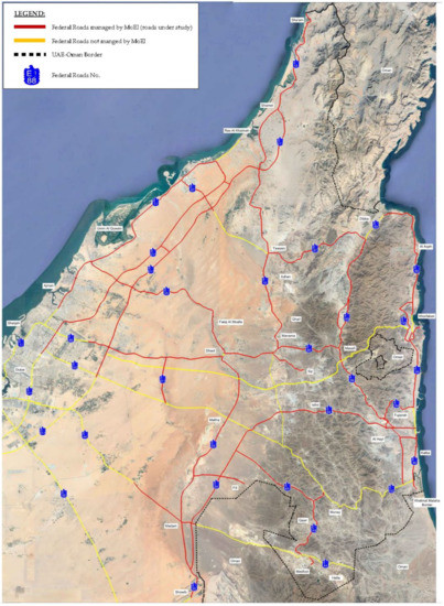 The Road Department indicated the year in which the roads were paved. Therefore, the age could be easily calculated based on the year of construction. However, it is known that the life span increases when a road section is maintained [21]. The Road Department in UAE adopts several initiatives to improve the quality of infrastructure, and the road networks generally undergo major treatments to improve the road conditions and to attain well-maintained roads. Due to this fact, this study assumes a maintained road section equivalent to a newly constructed road. Therefore, the age of the road was calculated from the time of maintenance. In addition, the road name, road type and location were also recorded.