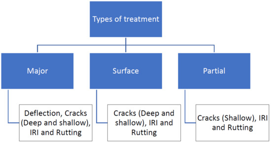 No information was available on the frequency of maintenance carried out. However, the type of maintenance was known from the discussions with the officials at the Road Department. In the road survey, the type of maintenance is divided into major maintenance, surface maintenance and partial maintenance. If all the distress values for a road section are corrected, it means that the section in question has undergone major treatment. In the case of surface treatment, maintenance measures for cracking, IRI and rutting are carried out and the deflection of the section is not maintained. Partial treatment, however, involves correction of IRI, ruts and shallow cracks, while deep cracks and deflection remain. The maintenance types are shown in Figure 5.
