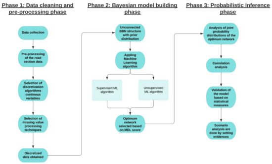 The framework presented in this study evaluates the use of BBN techniques in modelling road data to help highway authorities make wise decisions. The design of the framework was carried out using BayesiaLab 10.2, a software tool based on BBN that is particularly suitable for realizing causal relationships between the variables under study [29]. The framework mainly comprises three phases: the data cleaning and pre-processing phase, the Bayesian model building phase and the probabilistic inference phase. The first phase is the most important, as the whole analysis is carried out on the processed data obtained from this phase. The collected data should undergo appropriate pre-processing before being fed into the ML tool. In the data cleaning and pre-processing phase, the variable type, the techniques for processing missing values and the discretization method are determined.