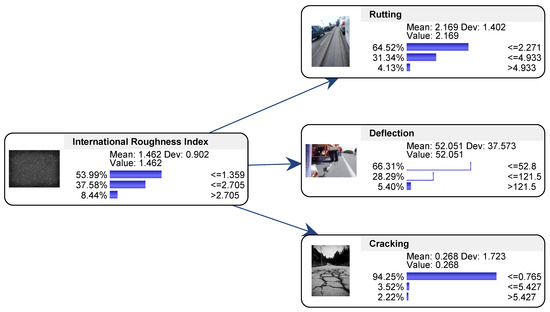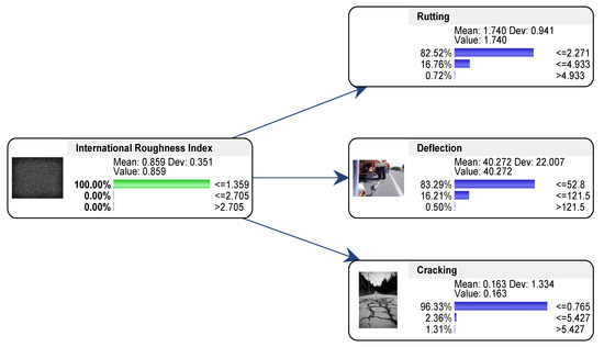 In addition, this study has investigated the distress parameters that occur with different types of roads. Although previous studies have focused intensively on the influence of structural, traffic and environmental factors on pavement deterioration, less attention has been paid to variation according to road type. The results suggest that the effort and time required to monitor roads can be optimized if the road distress parameter prominent on each type of road is known. Bayesian belief networks are advantageous over other methods when dealing with complex data, as they facilitate the interpretation of results, offer better computational efficiency and provide more practical results [24].