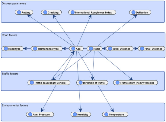 Bayesian network for road distress parameters, road factors, traffic factors and environmental factors.