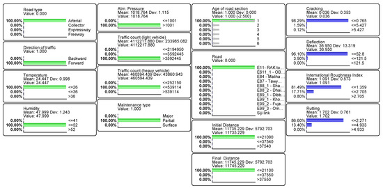 The measurement intervals of the individual parameters were different, as shown in Table 1. Therefore, the first task in the pre-processing was to apply different spreadsheet formulas to obtain uniform measurement intervals and intercepts for the parameters. The distress values corresponding to the starting point of the road network to the endpoint were listed in a continuous format of 10 m. Consequently, the road networks in the study were divided into a total of 132,999 road sections, each of 10 m length. An illustration of the pre-processing procedure can be found in Table 2.