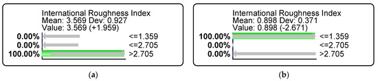 A sensitivity analysis was conducted to examine which distress parameter had the greatest impact on each road type. The widely used method for conducting a sensitivity analysis is to vary the probability distribution of each input factor and to observe the associated change in the target variable [19]. Here, the distress parameter is the input factor, and road type is the target variable. This approach was followed in this study to examine the variations in road type for two cases for each distress parameter.