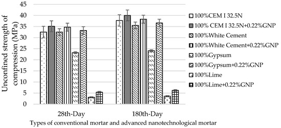 After 28 days, a maximum USC of 35.1 MPa for CEM type I 32.5 N + GNP mortar (Figure 1) was obtained. Thus, the addition of GNP proved to be a significant activator for Portland cement, white cement, gypsum, and lime binders. The USC of mortar containing GNP is related to the hydration of the cement and the activation reaction among the GNP and calcium hydroxide (CH), regardless of binder type. According to Meng and Khayat’s results [23], ultra-high strength construction materials, including those supplemented with GNP, exhibited an ultra-high strength gain. The data indicate that there was a decrease in bulk density when using ash. This was due to the specific density of ash being lower than that of the sand it replaced. The USC results for the mortar composites with GNP were slightly higher than for those without GNP at 28 d and 180 d (Figure 1). Due to the powerful effect of GNP, the calcium hydroxide was transformed to calcium carbonate hydroxide hydrate (CCH), and even at the later age (180 d), the determined USC for the mortars containing GNP was greater than that of the conventional mortars.