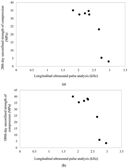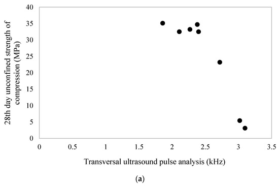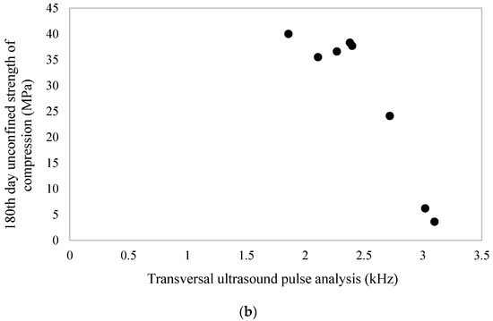 In light of this explanation, we expect that these equations can be used in practices such as the tracking of material conformity and the qualitative and quantitative evaluation of construction and detrimental effects, e.g., frosting and thawing, earthquake, and fire. Possibly, the equations could be found in practices regarding the conservation of existing buildings and cultural heritage. By rapidly measuring the material response non-destructively, the results of non-destructive measurement can be compared with materials that are not subjected to difficult conditions in terms of homogeneity, uniformity, and monitoring the deterioration of material properties with time. Figure 3 illustrates the powerful correlation among the unconfined strength of compression and transversal UPA on the (a) 28th day and (b) 180th day.