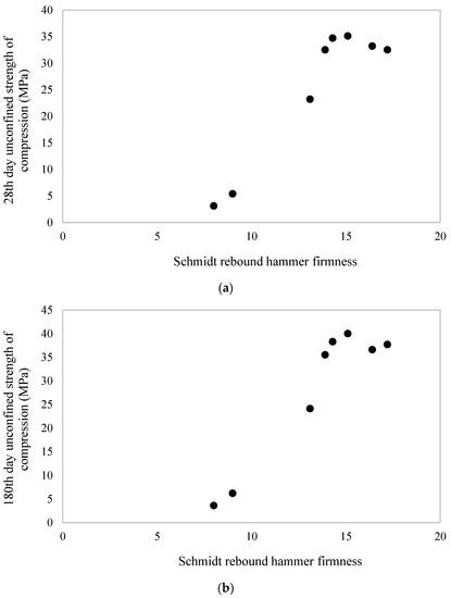 Powerful correlation among the unconfined strength of compression and Schmidt surface hardness on the (a) 28th day and (b) 180th day.