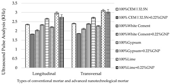 The continuous evaluation of the state of fresh mortar composite is required [40,41], and non-destructive methods are commonly utilized. The practice of ultrasound pulse analysis (UPA) in the quality control of cement-based material dates back to 1980 for ordinary cement types and blended cement types [42]. It can be measured in four different ways: longitudinal velocity measurement, transverse velocity measurement, and surface velocity measurement. In binder-based construction materials, the most commonly measured parameter is the longitudinal ultrasound pulse. The velocities of the transverse and outer-surface ultrasound pulses can be tested, and correlations among these UPA aspects and the physical and mechanical features of construction materials can be identified [27,43,44]. Figure 5 plots the UPA values in the longitudinal and transversal directions for the various mixes. Apart from the white cement mortar mix, the presence of GNP caused a reduction in UPA.