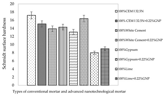 Figure 6 shows the change in the Schmidt surface hardness of the mortar composites as a function of 28d of water curing. The addition of GNP increased the Schmidt surface hardness from 17.2% to 15.1% for Portland cement mortar; 13.9% to 14.3% for white cement mortar; 13.1% to 16.4% for gypsum mortar; and 8% to 9% for lime mortar. This positive effect of the GNP is due to the generation of the hydration product and the reduction in pores related to the water in the mixture.