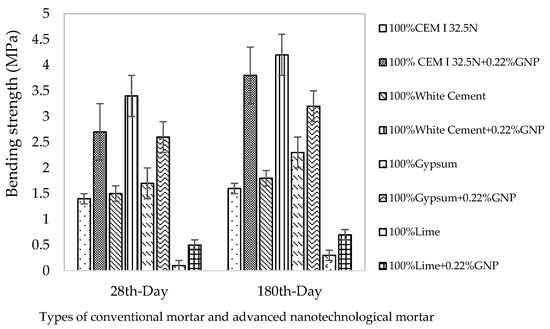 The addition of GNP increased the 28d bending strength from 1.4, 1.5, 1.7, and 0.1 MPa to 2.7, 3.4, 2.6, and 0.5 MPa for the Portland cement mortar, white cement mortar, gypsum mortar, and lime mortar, respectively. At 28 d, the addition of GNP to the mortar composite made of 100% CEM I 32.5N cement led to a 92% increase in the bending strength; beyond this increase, a remarkable hardness was also observed. The bending strength of the mortar composite containing white cement increased by up to 266.67% with the addition of GNP. The comparative increment in the bending strength of 100% gypsum and 100% lime mortar composites with GNP were recorded as 52.9% and 500%, respectively. Additionally, an increase similar to that of the 28d bending strength was also provided by the GNP supplement for the 180d bending strength of the mortar composites. A GNP concentration of 0.22% also increased the 180d bending strength from 1.6 MPa, 1.8 MPa, 2.3 MPa, and 0.3 MPa to 3.8 MPa, 4.2 MPa, 3.2 MPa, and 0.7 MPa for the Portland cement mortar, white cement mortar, gypsum mortar, and lime mortar, respectively. At 180 d, the addition of 0.22% GNP to the mortar composite made of 100% CEM I 32.5N cement led to an increase of 237.5% in the bending strength; similarly, a remarkable strength gain was also observed. The bending strength of the mortar composite containing white cement increased by up to 233.3% with the addition of 0.22% GNP. The comparative increment in the bending strength of the 100% gypsum and 100% lime mortar composites with 0.22% GNP were recorded as 39.1% and 233.3%, respectively.