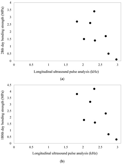 Figure 8 shows the correlation between bending strength and the longitudinally measured UPA on (a) the 28th day and (b) the 180th day.