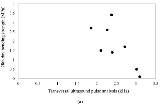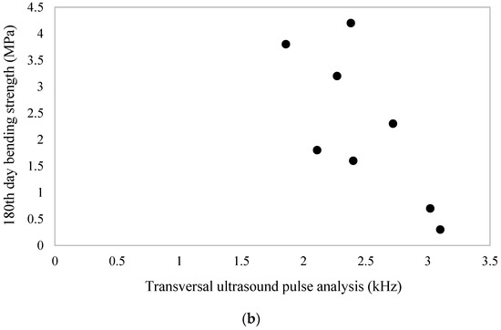 Figure 9 shows the correlation between bending strength and the transversal UPA on (a) the 28th day and (b) the 180th day.