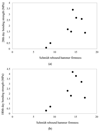 Figure 10 shows the powerful regression relationship between bending strength and Schmidt surface hardness on (a) the 28th day and (b) the 180th day.