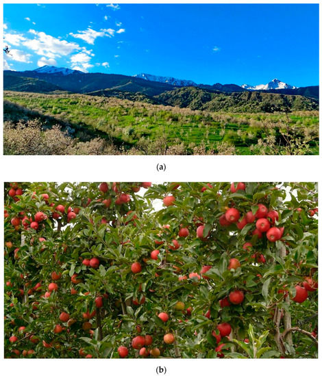 Apple orchards in the vicinity of Almaty. (a) https://adrenalinicsilence.kz/portfolio-archive/yablonevye-sady (accessed on 6 June 2022). (b) https://www.nur.kz/society/1879643-gektary-ablonevyh-sadov-vyrubili-v-almatinskoj-oblasti-video/ (accessed on 8 July 2021).