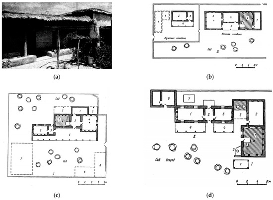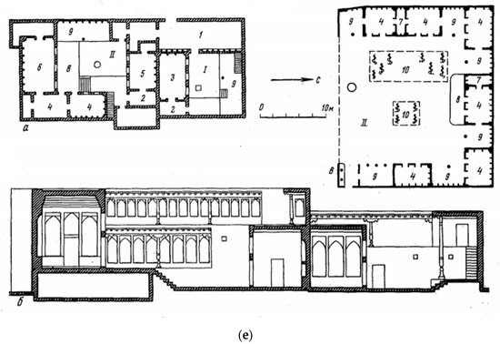 The traditional form of a rural house in the territory of Southern Kazakhstan is: (a) A house of traditional layout with an aivan, built in the village of Karnak in the 1930s. (b) The layout of traditional dwellings and estates of the late 19th to early 20th century for the wealthy strata of the population. (c) The plan of the judge’s house and estate (treasury), built at the end of the 19th century. V. S. Karnak (s—z Atabaevsky) Turkestan district of the Shymkent region. (d) The plan of a house built during the Soviet period in the village of Ikan (Eski Ikan), the Turkestan district of the Shymkent region. Source: A. N. Zhilina, Traditional settlements and housing of the Uzbeks of Southern Kazakhstan, E.E. Nerazik and A.N. Zhilina “Housing of the peoples of Central Asia and Kazakhstan”, Moscow: Nauka, 1982. (e) Perimeter yard construction: a, b—house in Bukhara (plan and section), c—house in Kitab (plan). (https://www.academia.edu (accessed on 8 July 2021)).