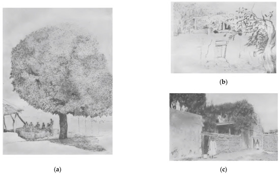 L.S. Zalesskaya also studied how the traditional houses of the peoples of Central Asia were arranged (Figure 3). She describes the folk dwelling as follows: “The old Central Asian city with its narrow winding streets was rich in greenery, but it was located almost exclusively on estates—in courtyards, behind residential buildings, along ditches” [24]. The residential courtyard of a house in Central Asia would include a plot with an orchard, garden crops, and several ornamental plants. The old city, with its empty streets and richly landscaped courtyards, has been considered a characteristic of Central Asia for a long time. In the writings of travelers of the 18th and 19th centuries, we find detailed descriptions of gardens [25,26], surrounded by duvans (cob walls) with a water reservoir, a sufa (artificially raised platform made of ground excavated from the pool, used as a resting place), and an iwan. A large number of vined pergolas creates dense shadows. A carefully constructed area near the house and outbuildings would be surrounded by flowers. A small garden irrigated with a ditch would be planted with tomatoes, corn, and melons. Apricots, peaches, mulberry trees, almonds, pomegranates, apples, wild apricots, quince, pears, and fig trees would grow in the garden. The free space in the garden would be sown with alfalfa. There would have been no track layout; only the straight grooves of ditches divided the territory. The fruit garden would usually have been bordered by rows of decorative trees (Lombardy poplar, sycamore, purple osier [willow]). Purple osier would often be planted near a fence to create a dense hedge. The closer you got to the city center, the smaller the areas of the yards would become, with the gardens reduced to one decorative, wide-crown tree and a small bed with crops of corn and flowers. Almost universal to the yards were vined trellises and pumpkins growing up a pergola near a house wall. A high duvan would be richly ornamented, on the entrance side, with a complex pattern etched into the clay wall [24].