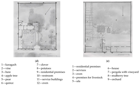 Traditional folk dwelling in Central Asia (according to Zelenskaya L.S.): (a) elm tree, (b) vineyard on the 2nd floor of a house (Kokand city), (c) vineyard on the 2nd floor of a house (Samarkand city), (d) Nuridinov Nabi house plan (Samarkand, Penjikentskaya St.), (e) plan of a country house on Khiva St., Samarkand. (https://docviewer.yandex.kz (accessed on 8 July 2021)).