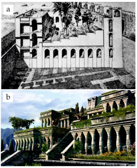 Hanging Gardens of Semiramis (graphic reconstruction); (a) https://present5.com/arxitektura-dvurechya-mesopotamiya-1-v-tys-do-n/ (accessed on 8 July 2020); (b) http://ancient-buildings.ru/architektura-drevnego-vostoka/gde-nachodilis-visyachie-sadi.html (accessed on 1 June 2022).
