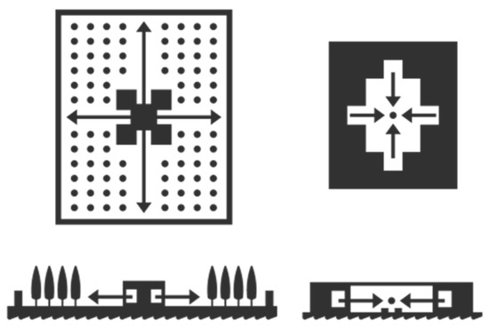 Two schemes of architectural gardens in the chor-bag form: “perimeter wall–garden–central pavilion” and “perimeter building–garden” [33].