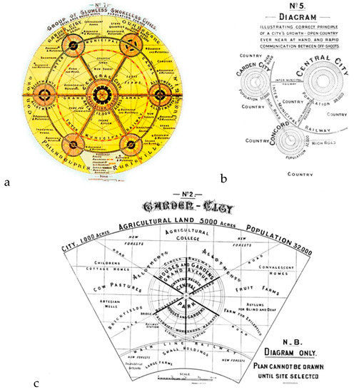 The Garden City Model (by E. Howard): (a) Garden city scheme https://standard.kz/ru/post/kreativ-vmesto-primitivnogo-uplotneniya-alternativa-gorod-sad (accessed on 8 June 2021); (b) Garden City diagram https://upload.wikimedia.org/wikipedia/commons/a/ae/Garden_Cities_of_Tomorrow%2C_Nos._4_%26_5.png (accessed on 8 June 2021); (c) Scheme of the master plan of the garden city https://commons.wikimedia.org/wiki/File:Garden_Cities_of_Tomorrow,_No._2.jpg (accessed on 8 June 2021).