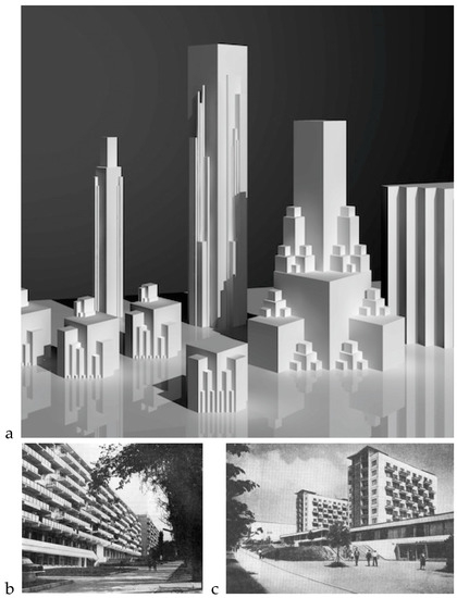 (a) Malevich‘s architectons.https://thecharnelhouse.org/2012/11/22/the-arkhitektons-and-planets-of-kazimir-malevich (accessed on 8 June 2022); (b) Alma-Ata. Residential buildings on Lenin Avenue. Architects N. Ripinsky, T. Basenov, A. Petrov, etc.; (c) Vilnius. Žirmunai. Microdistrict D-18. Architects B. Kasperaviciene, B. Kruminis. 1967. Type of development http://ussr.totalarch.com/general_history_architecture/1955_1970/house_social (accessed on 8 June 2022).