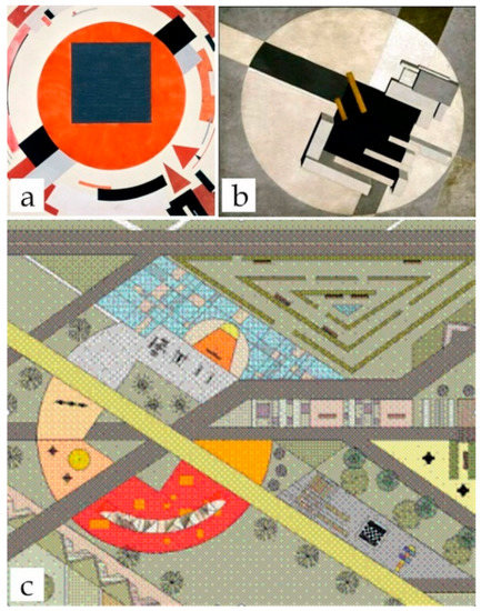 Malevich’s plane suprematism resulted in volumetric–spatial compositions called architectons (Figure 7a). These served as the prototype for new architectural forms, including residential buildings built in the 20th century (Figure 7b,c).