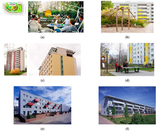 (a) Garden plots centered on the courtyard of a residential building. (b) Landscaping example for a residential courtyard within the Lobeda area, Jena—landscaping example where a tree is used, and creating green space is the main landscaping element. (c) Additional stories within the Lobeda area, Jena. Similar projects were implemented from 1990–2000. (d) Social ties between residents are a key safety factor. Wuhletal cooperative courtyard. Source: M. Melnikova “Not just panel buildings”. (e,f,h) Projects for the reconstruction of buildings by the German architect Stefan Forster. (g) Open terraces instead of the former balconies. Source: (https://archi.ru/russia/6176/shtefan-forster-znatok-pyatietazhek (accessed on 19 January 2022).