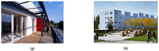 The German architect Stefan Forster radically changed the internal and external environments of five-story buildings, expelling any negative sentiment and significantly improving the dwellers’ lifestyles (Figure 9e–h) [55]. In a European city, where history must always be considered, the typology of existing buildings demands building different buildings. Residents of each house received small gardens, or “green rooms”, as the author called them—their own comfortable private spaces sectioned off from the street by a low fence. The idea was to change the image of the area to that of a traditional German city—a garden.