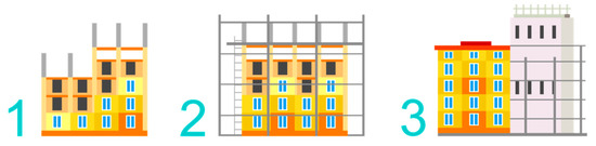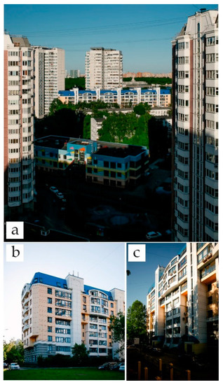 A detailed study was carried out by Maria Melnikova. She studied typical series of residential buildings in Russia, Germany, and the Baltic countries. Melnikova M. reviewed the possibilities of upgrading the large-scale developments in residential areas of various cities in these countries [13] (Figure 9a–d). She particularly studied the social prerequisites for reconstructing residential buildings in specified periods. It was recognized that four- to five-story panel houses do not only comprise a huge amount of living space in modern cities. They also help develop a unique community of townspeople (society) who need a more comfortable living environment and who, at the same time, do not want to alter their place of residence by moving to the outskirts of the city.
