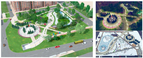 The solution to designing a residential yard is here considered via the example of the city of Izhevsk (Figure 12). A conceptual solution is shown that defines functional zoning as well as transport and pedestrian connections. The landscaping of property in the vicinity of the Palace of Pioneers, “Zvezdny”, was achieved using conceptual associations: a round square with a monument in the center embodies the heliocentric system of the Order of the Revolution—the sun is represented by benches; flower beds and stairs are the orbits of the planets; lanterns are stars; the lighting built into the coating resembles a photograph of the starry sky taken with a long camera exposure; the playground represents the lunar surface; the smooth shape of the ice rink resembles the image of the icy dwarf planet Pluto, with the famous spherical willow representing hope for extra-terrestrial life, etc. [57].