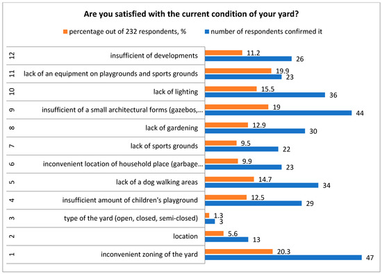 During our on-site surveying of the reconstructed territory, the interests of groups of residents were identified (Figure 13 and Figure 14), which can be grouped in the following areas: chess, amateur performance, sports, gardening, children’s creativity, animal lovers (dogs and cats), etc. These interests and activities were related to certain places in the territory under consideration, in the form of amateur chess players playing on benches, children’s drawings on asphalt and plein-air paintings near the entrance area to an art school, gardens well-tended by residents, walking “dog lovers”, etc.