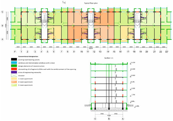 We have established a design solution for reconstructing a standard, large-scale series of residential buildings from the Soviet period, exemplified by the reconstruction of five-story buildings in Moscow (Figure 10 and Figure 11). At this stage of reconstruction, a re-planning of apartments was proposed to create comfort; a superstructure of floors and enclosing constructions, pylons, and monolithic frames were built, and an elevator and ventilated facade were installed [56].