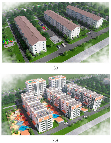 Project proposal (author’s) for the reconstruction of a residential group in Almaty: (a) before reconstruction; (b) after reconstruction (Author’s material).