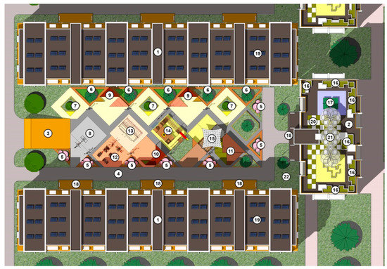Residential yard reconstruction project (Author’s material). 1: Reconstructed 4-story residential apartment building with an extension of an additional floor with an attic; 2: Project 9-storey apartment building with commercial premises and an operational roof; 3: Entrance to underground parking located under the yard area; 4: Fire passage; 5: Flower bench; 6: Bench with a tree; 7: Bench with apple tree; 8: Streetball sector; 9: Gazebo Type-1; 10: Gazebo Type-2; 11: Gazebo Type-3; 12: Outdoor exercise equipment sector; 13: Training horizontal bars sector; 14: Playground sector for active games; 15: Children’s sandbox sector with an umbrella; 16: Flower myths; 17: Tennis tables; 18: Entrance group with a ramp under the canopy; 19: Solar panels; 20: Operated roof; 21: Decorative awnings or umbrellas; 22: Elements of landscaping.