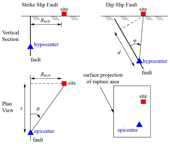 Input parameters of the models for high-frequency components and the forward-directivity pulse are determined through linear predictive equations developed by Dabaghi et al. [,,], according to the source and site characteristics. Specifically, seven parameters are selected for the predictive equations, including the type of faulting (F), the moment magnitude (M), the depth to the top of the rupture plane (ZTOR), the closest distance from the site to the fault rupture (RRUP), the shear-wave velocity of the top 30 m of soil at the site (Vs30), and directivity parameters s (or d) and θ (or φ). The schematic of the directivity parameters is plotted in Figure 1. Detailed procedures for the regression of these model parameters can be found in [,,].