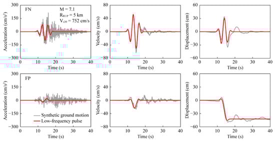 This study generates synthetic across-fault ground motions by combining the simulated coherent (long-period) and incoherent (high-frequency) components. Specifically, the high-frequency components in horizontal directions (FN and FP directions) are simulated with a stochastic model proposed by Dabaghi et al. [,,], whereas the long-period components are simulated according to the pulse model proposed by Mavroeidis et al. []