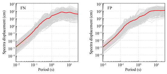 The synthetic motion pairs are then scaled using a factor ranging from 0.5 to 3 with an increment of 0.5. Thus, 150 ground-motion pairs are generated for the nonlinear time-history analysis. Figure 6 presents the spectra displacement of the input ground motions in FN and FP directions. It shows that the component in the FP direction has larger displacements than that in the FN direction in the long-period range.