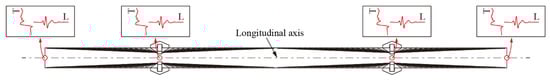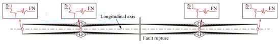 According to previous studies, cable-stayed bridges are suggested to cross the fault perpendicularly []. Therefore, in this study, the fault rupture should cross the bridge in its middle span with an angle of 90°. The time-history series applies to the bridge supports in the FN and FP directions. Because this study focuses on the vertical strike-slip scenario, the ground dislocation is assumed to distribute equally at the two sides of the fault. As a result, the FN ground motions are the same on each fault side, whereas the FP ground motions have equal amplitudes but with reversed polarity [] (as shown in Figure 7). To exclude the interference of the effect of vertical ground motions and mainly consider the effect of the FN and FP components, the vertical motions are not considered in this study. The wave passage effect is not considered as well.