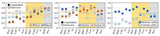Figure 8 plots the determination coefficients for the regressions in the case of each IM candidate. As shown in Figure 8, the largest R2 varies for different EDPs. Additionally, R2 can be significantly different for an EDP in different directions. For example, PGV performs well in predicting the transverse bearing displacements, pylon responses, and the backstay cable’s force but may not provide reliable predictions on bearing displacements in the longitudinal direction and the force of forestay cables. Therefore, it is difficult to identify the optimal IM from R2 directly. The multicriteria decision-making (MCDM) method is adopted to tackle this issue. In each MCD, there are several alternatives and criteria. The alternative with the highest score is selected as the best one and is placed in the first rank []. In this research, different IMs are considered alternatives, and the corresponding determination coefficients R2 for different components are chosen as criteria.