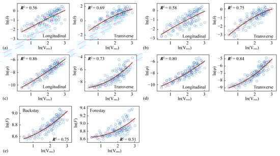 According to the rank of the IMs for different weight assignments, it is found that Vrms is the optimal one among the 12 candidates. Results also demonstrate that the velocity-dependent IMs perform better than the others for all the weight assignments. Moreover, it is worth mentioning that PGA, which has been used as the optimal IM for seismic fragility analyses in previous studies [,], is inappropriate for cable-stayed bridges that cross fault ruptures. The PSDMs established for each EDP using Vrms are illustrated in Figure 9, and the corresponding regression coefficients are listed in Table 7. It is worth noting that the hazard curve for Vrms is unavailable. However, it is possible to establish the correlation between Vrms and an IM with available hazard curves, with the development of ground-motion prediction equations, using similar methods introduced in [].