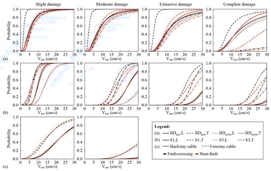 Figure 14c and Table 9 show that the vulnerabilities of the stay cables are almost the same under slight and moderate damage states, whether the bridge is across a fault rupture or not. Such phenomena can be attributed to the fact that the cable force is mainly affected by the vertical and longitudinal deformations of the girder and pylons, and these deformations of the near-fault bridges are supposed to be similar to those of the fault-crossing bridges.