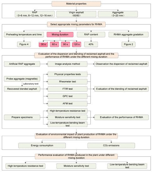 Previous studies have evaluated the blending degree of RAP in RHMA by considering the mixing temperature, mixing duration, RAP content, and blending method. RHMA and blended asphalt perform differently depending on the degree of blending of RAP. However, only a handful of studies have considered the effects of RAP aggregate gradation and RHMA gradation when used in practice. In addition, there are few studies that have been conducted on both properties: the chemical components of blended asphalt and the performance of RHMA considering the blending degree of RAP. There are also few studies that have been conducted to determine the optimal mixing duration of RHMA in the plant and in the laboratory that consider the performance and the environmental impact of RHMA. Hence, the objectives of the study were to observe and evaluate the dispersion and blending of reclaimed asphalt and to analyze its effect on the properties, chemical composition, and morphology of blended asphalt, as well as the performance of RHMA. In practice, the blending method, mixing temperature, and RAP content are constant, while the mixing duration of RHMA can be adjusted. Therefore, this study considered the effects of different mixing durations on the dispersion and blending of reclaimed asphalt with the optimal temperature and mixing method. Furthermore, the optimal mixing duration of RHMA in the plant and the laboratory, considering the performance and the environmental impact, was determined. The framework of this study is summarized and illustrated in Figure 1.